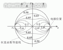 圖2以中心點權重為1,給出了電極平面的權重函數分布。由圖2可知,越接近電極,權重最大;反之,沿導管轉90°,權重最小。