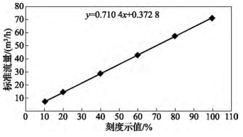 (1)把轉(zhuǎn)子流量計按玻璃管上的刻度示值做一遍檢定,得到如表1所示數(shù)據(jù),從中可以看出刻度示值為“100”和“80”時的引用誤差非常大,已經(jīng)無法正常使用(JJG257—2007《浮子流量計檢定規(guī)程》中規(guī)定引用誤差最大為5%)。