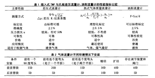 5大管徑流量儀表的比較插入式TMF、孔板式差壓流量計兩者均能檢測 大管徑流量 ,我們可以作一 比較 ,由表i中明顯看出大管徑插入式熱式氣體質(zhì)量流量計在各項性能 指標有很大的優(yōu)勢,因此它是差壓式流量計的替代品。氣體流量計根據(jù)具體的環(huán)境情況的安裝見表 2。